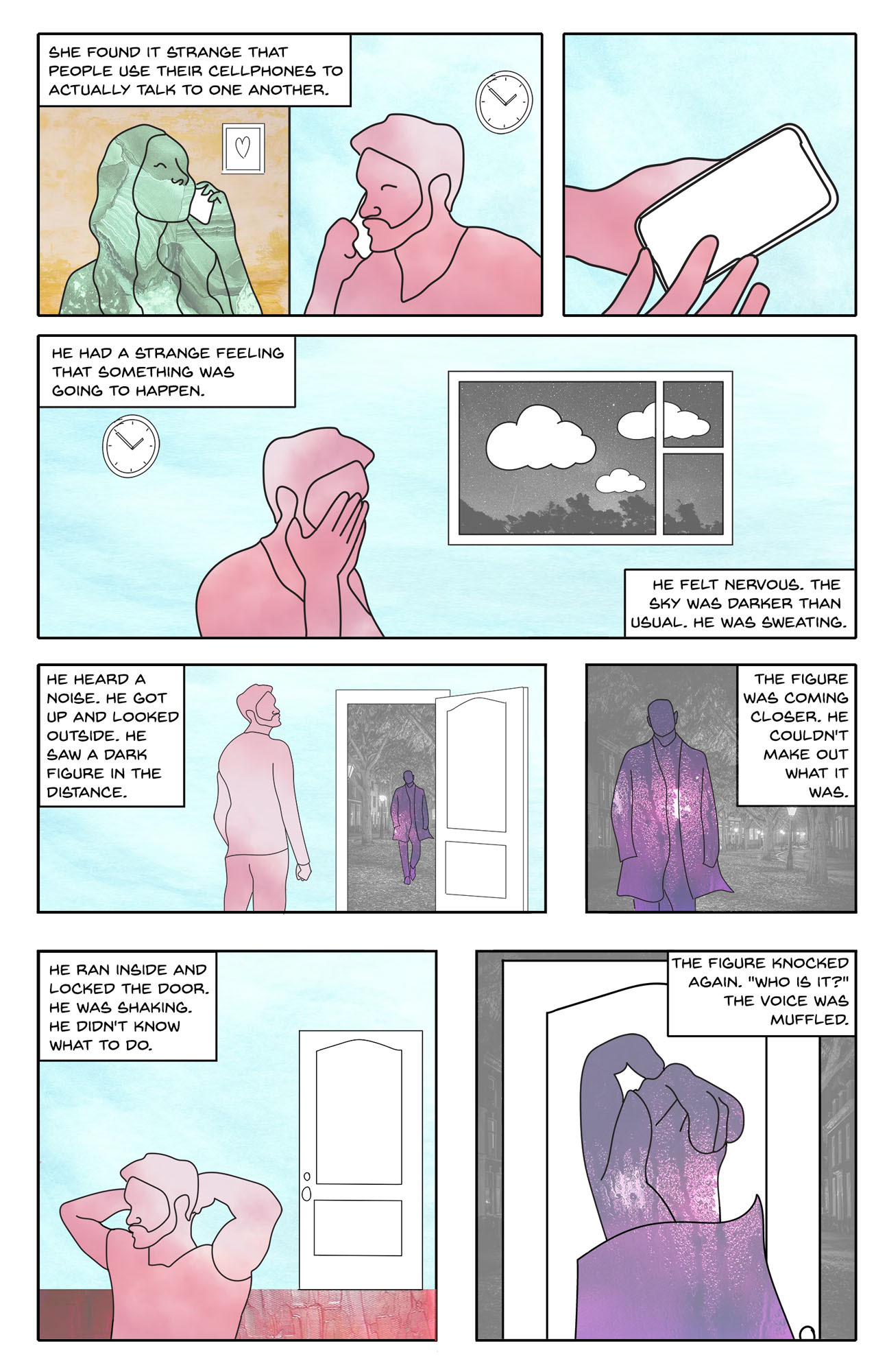 A digitally designed comic strip to go along with randomly generated text outputted through an artificial intelligence program.