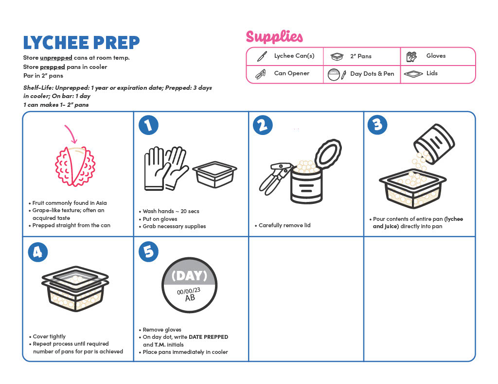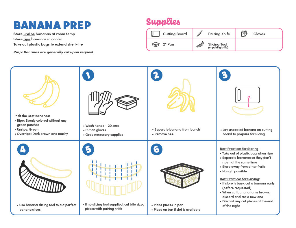 An informative fruit prep guide, that details specific rules on preparing fruit. With a fresh layout and bold picture icons, this helps to easily understand information.
