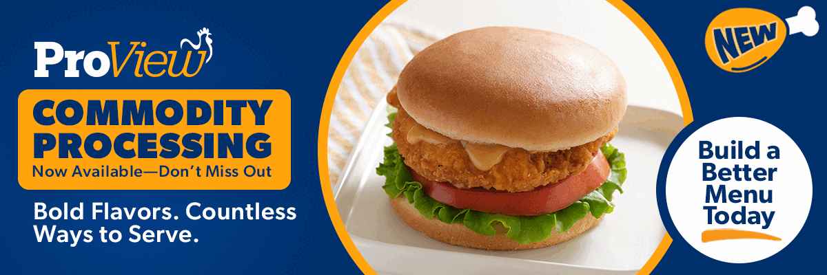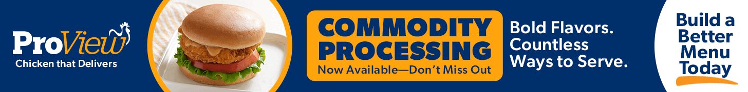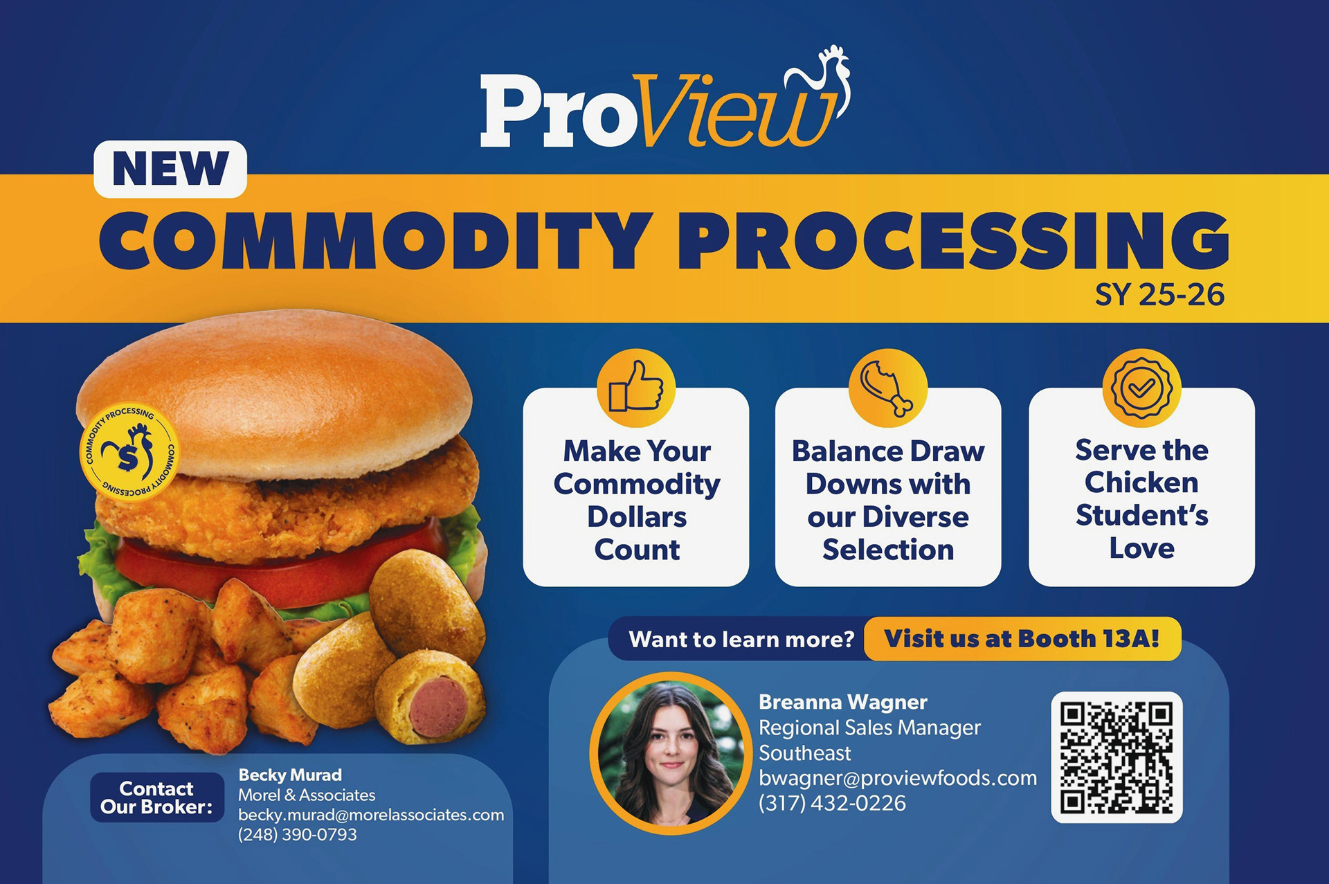 A digital and print campaign announcing Commodity Processing to school clients. The ads use clear typography, bold color blocks, and high-quality product photography to highlight key benefits.