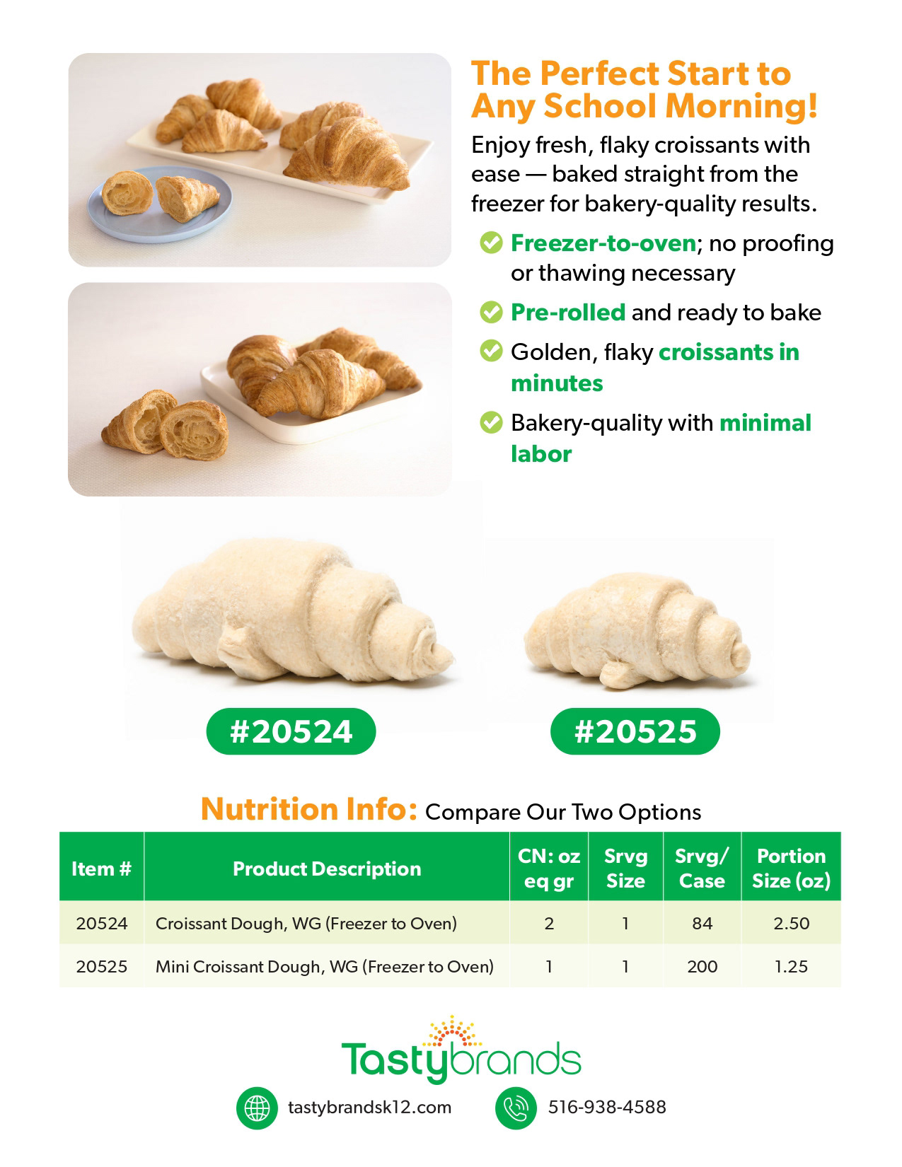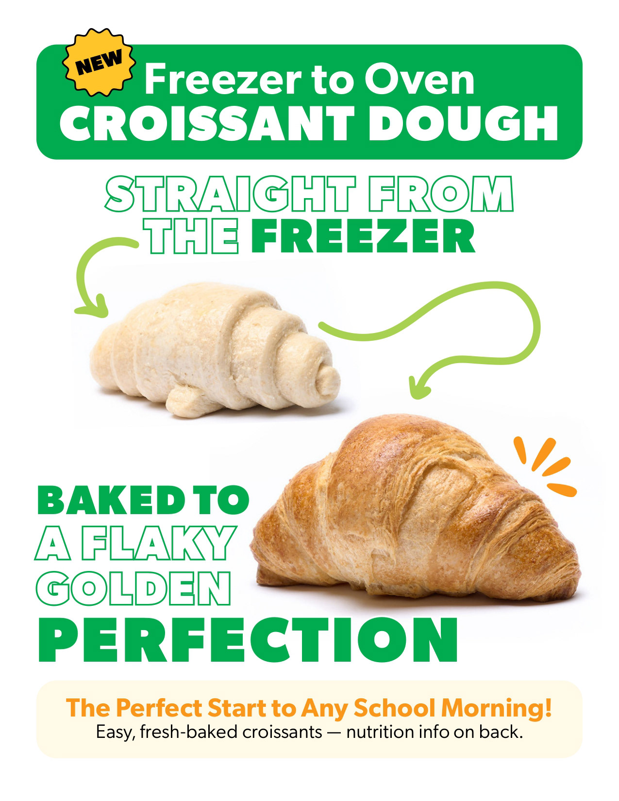 A flyer and social post promoting Freezer-to-Oven Croissant Dough, highlighting speed and bakery-quality benefits with clear typography and product photography across print and digital.