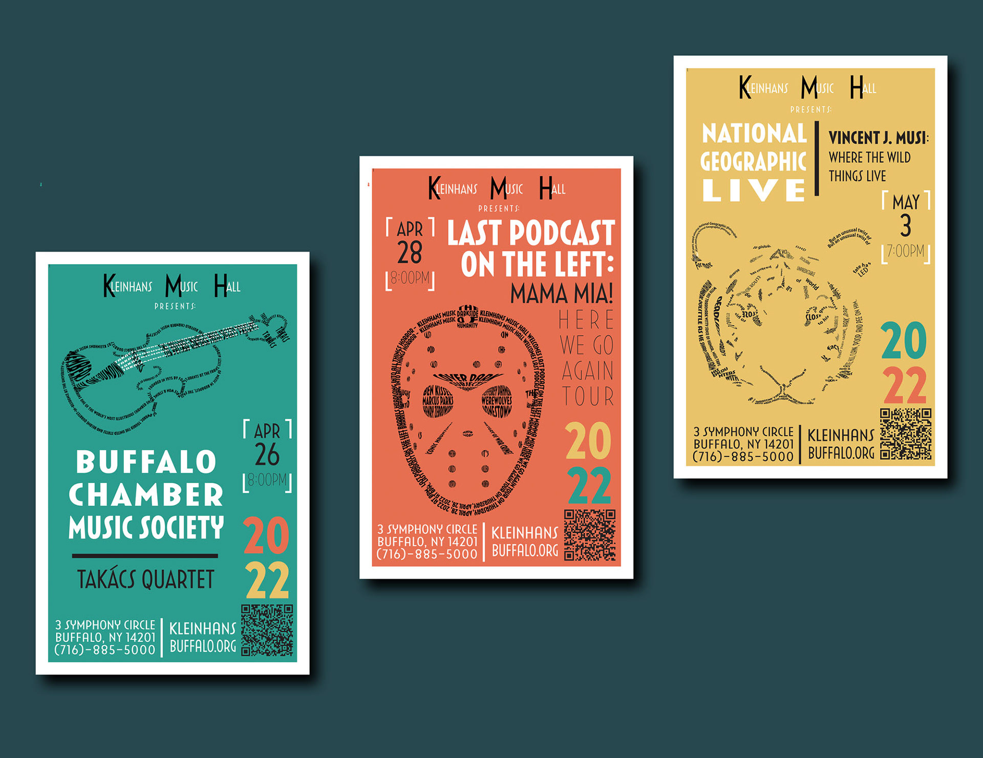 A set of posters created for Kleinhan's Music Hall to establish a classic identity and graphic voice for the cultural institution. The set of posters were made using only type, with the goal to convey specific ideas about each poster's content.