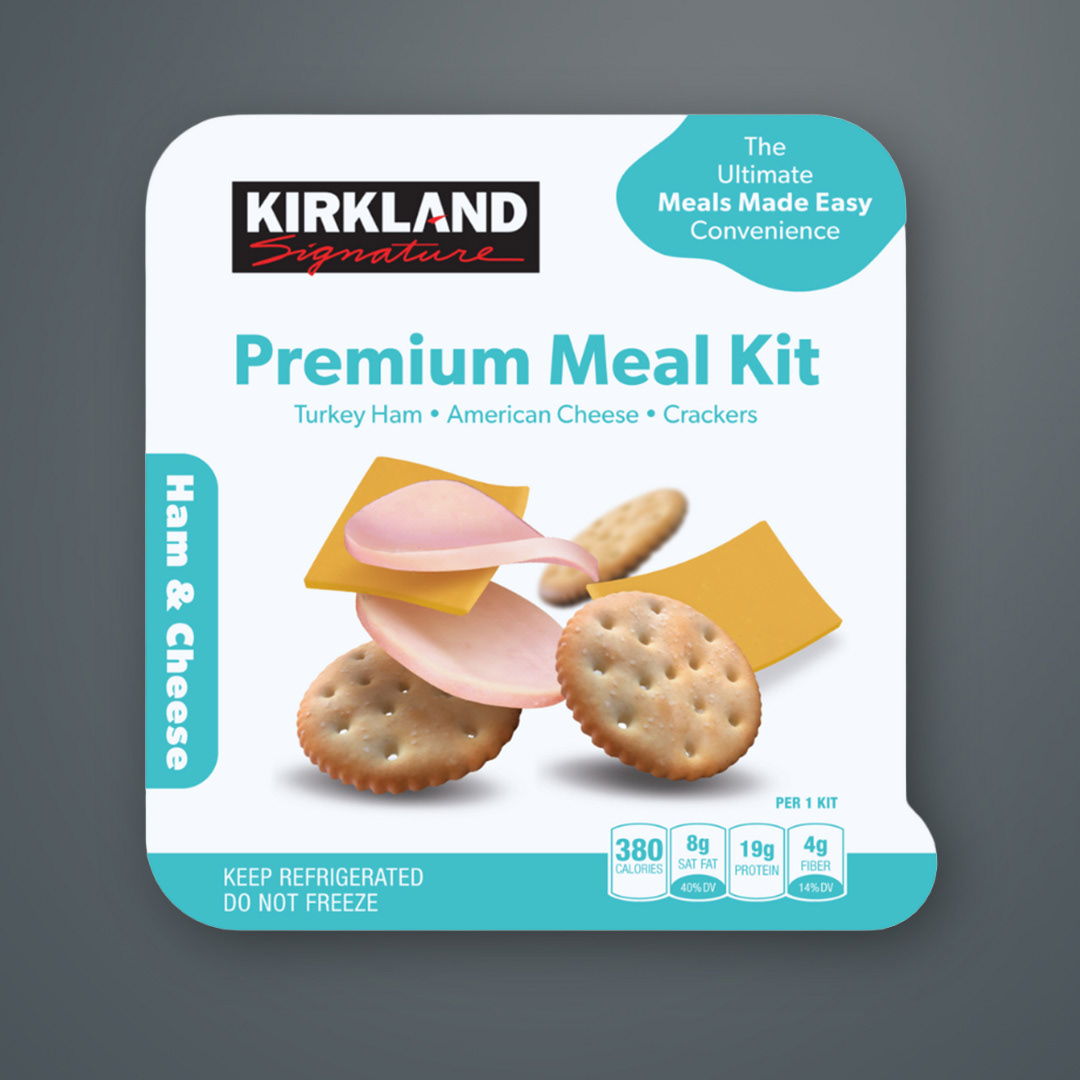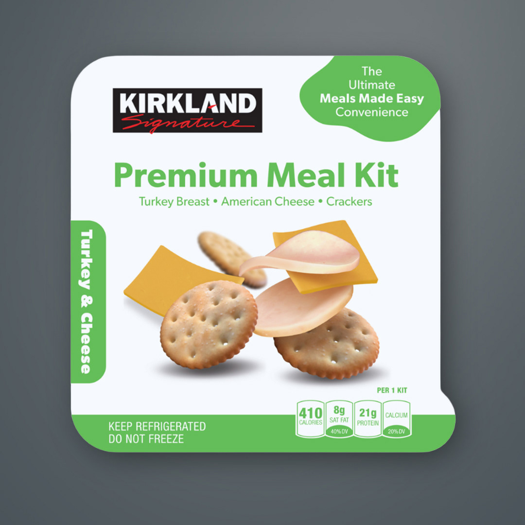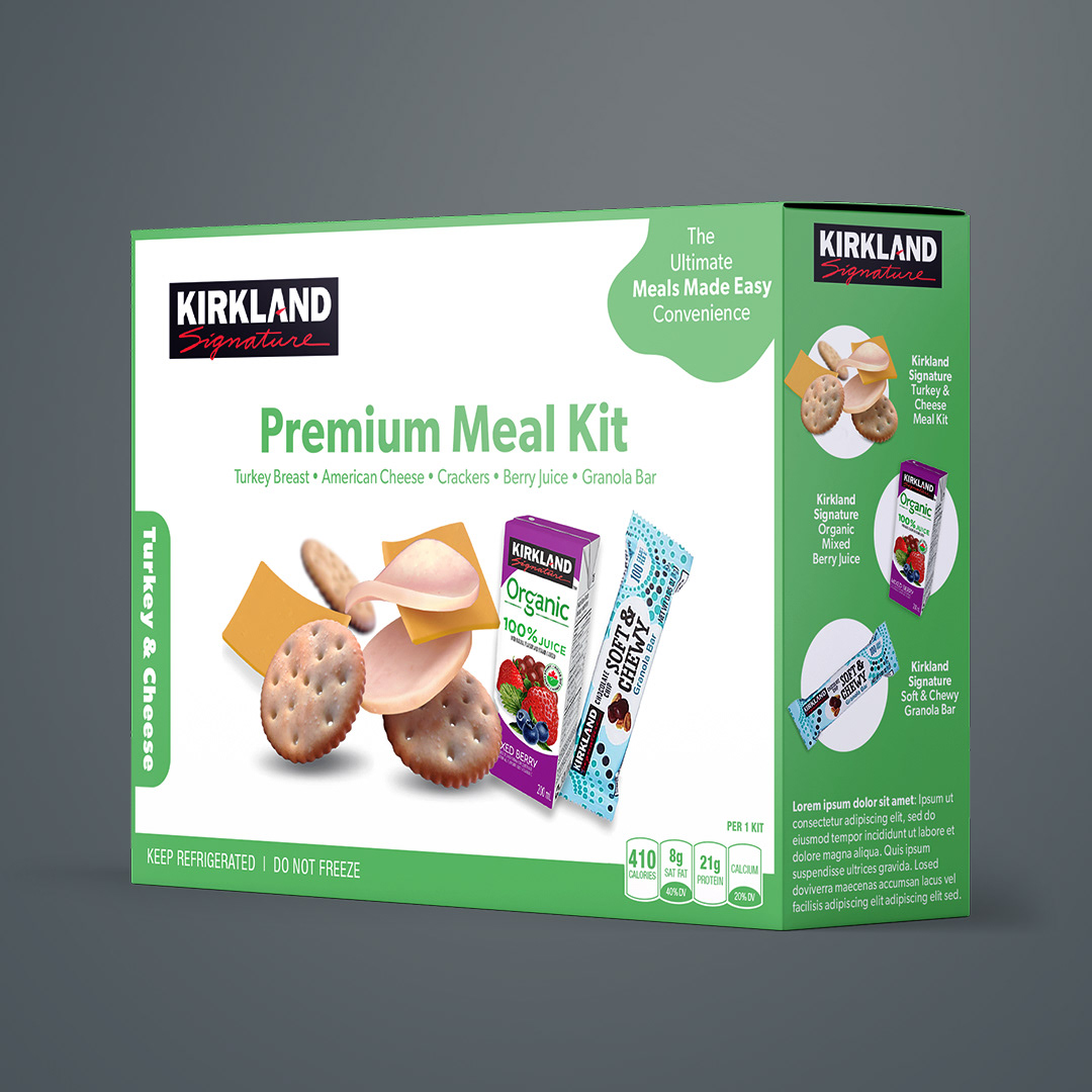 A series of concept packaging mockups for different convenience products, created for a Kirkland Signature brand pitch. Clean layouts with color-coded labels highlight quality, convenience, and make flavors easy to identify for Costco shoppers.