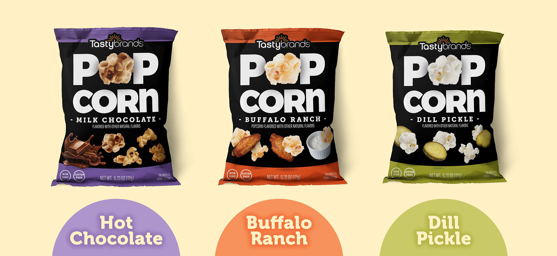 A modern packaging design for three popcorn flavors, using bold typography and vibrant colors to give each variety its own personality while maintaining a unified visual identity across the line.