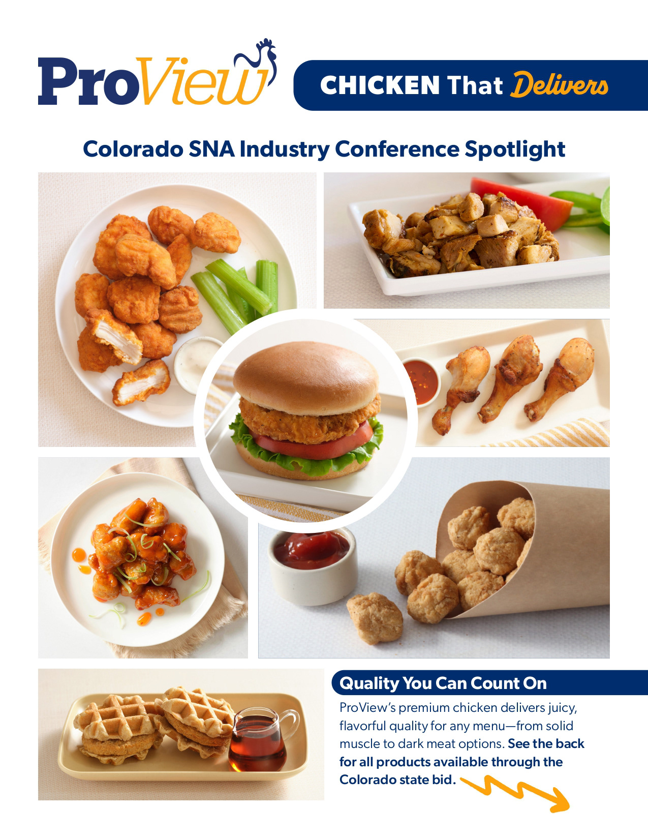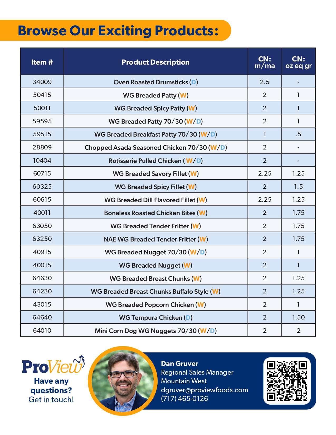 A single-page sales sheet with a front product grid and back table of item codes and nutritional info, designed as a clear, on-brand marketing piece.